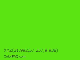 XYZ 31.992,57.257,9.938 Color is a normal green color and the nearest color is Harlequin Green #46cb18. Hex code #5ce312 and RGB value is rgb(92,227,18). In RGB color space, this color is composed of 36% red, 89% green, 7% blue, In CMYK color space, this color is composed of 59% cyan, 0% magenta, 92% yellow , 11% black , In HSL color space, this color has a hue angle of 99° , 85% saturation and 48% lightness.