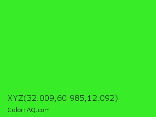 XYZ 32.009,60.985,12.092 Color is a normal green color and the nearest color is Neon Green #39ff14. Hex code #38ec28 and RGB value is rgb(56,236,40). In RGB color space, this color is composed of 22% red, 93% green, 16% blue, In CMYK color space, this color is composed of 76% cyan, 0% magenta, 83% yellow , 7% black , In HSL color space, this color has a hue angle of 115° , 84% saturation and 54% lightness.