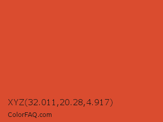 XYZ 32.011,20.28,4.917 Color is a normal red color and the nearest color is Punch #dc4333. Hex code #da4c2f and RGB value is rgb(218,76,47). In RGB color space, this color is composed of 85% red, 30% green, 18% blue, In CMYK color space, this color is composed of 0% cyan, 65% magenta, 78% yellow , 15% black , In HSL color space, this color has a hue angle of 10° , 70% saturation and 52% lightness.