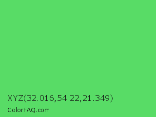 XYZ 32.016,54.22,21.349 Color is a normal green color and the nearest color is Emerald #50c878. Hex code #58dc66 and RGB value is rgb(88,220,102). In RGB color space, this color is composed of 35% red, 86% green, 40% blue, In CMYK color space, this color is composed of 60% cyan, 0% magenta, 54% yellow , 14% black , In HSL color space, this color has a hue angle of 126° , 65% saturation and 60% lightness.