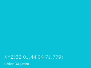 XYZ 32.01,44.04,71.779 Color is a normal cyan color and the nearest color is Turquoise Surf #00c5cd. Hex code #08c3d8 and RGB value is rgb(8,195,216). In RGB color space, this color is composed of 3% red, 76% green, 85% blue, In CMYK color space, this color is composed of 96% cyan, 10% magenta, 0% yellow , 15% black , In HSL color space, this color has a hue angle of 186° , 93% saturation and 44% lightness.