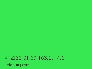 XYZ 32.01,59.163,17.715 Color is a normal green color and the nearest color is UFO Green #3cd070. Hex code #38e852 and RGB value is rgb(56,232,82). In RGB color space, this color is composed of 22% red, 91% green, 32% blue, In CMYK color space, this color is composed of 76% cyan, 0% magenta, 65% yellow , 9% black , In HSL color space, this color has a hue angle of 129° , 79% saturation and 56% lightness.