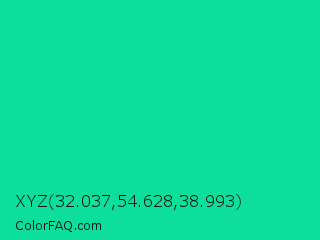 XYZ 32.037,54.628,38.993 Color is a normal green color and the nearest color is Caribbean Green #00cc99. Hex code #0dde99 and RGB value is rgb(13,222,153). In RGB color space, this color is composed of 5% red, 87% green, 60% blue, In CMYK color space, this color is composed of 94% cyan, 0% magenta, 31% yellow , 13% black , In HSL color space, this color has a hue angle of 160° , 89% saturation and 46% lightness.