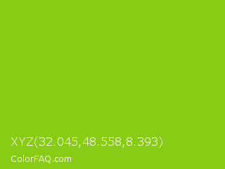 XYZ 32.045,48.558,8.393 Color is a normal green color and the nearest color is Sheen Green #8fd400. Hex code #89cc15 and RGB value is rgb(137,204,21). In RGB color space, this color is composed of 54% red, 80% green, 8% blue, In CMYK color space, this color is composed of 33% cyan, 0% magenta, 90% yellow , 20% black , In HSL color space, this color has a hue angle of 82° , 81% saturation and 44% lightness.