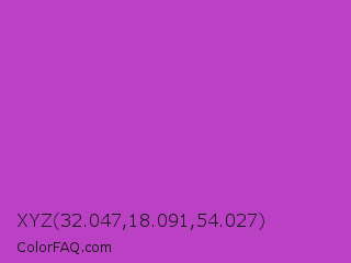 XYZ 32.047,18.091,54.027 Color is a normal magenta color and the nearest color is Fuchsia Pink #c154c1. Hex code #ba40c4 and RGB value is rgb(186,64,196). In RGB color space, this color is composed of 73% red, 25% green, 77% blue, In CMYK color space, this color is composed of 5% cyan, 67% magenta, 0% yellow , 23% black , In HSL color space, this color has a hue angle of 295° , 53% saturation and 51% lightness.