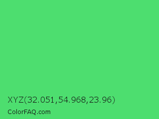 XYZ 32.051,54.968,23.96 Color is a normal green color and the nearest color is UFO Green #3cd070. Hex code #4dde6f and RGB value is rgb(77,222,111). In RGB color space, this color is composed of 30% red, 87% green, 44% blue, In CMYK color space, this color is composed of 65% cyan, 0% magenta, 50% yellow , 13% black , In HSL color space, this color has a hue angle of 134° , 69% saturation and 59% lightness.