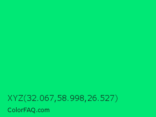 XYZ 32.067,58.998,26.527 Color is a normal green color and the nearest color is Spring Green #00ff7f. Hex code #00e875 and RGB value is rgb(0,232,117). In RGB color space, this color is composed of 0% red, 91% green, 46% blue, In CMYK color space, this color is composed of 100% cyan, 0% magenta, 50% yellow , 9% black , In HSL color space, this color has a hue angle of 150° , 100% saturation and 45% lightness.