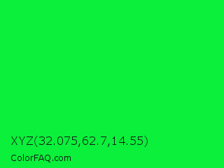XYZ 32.075,62.7,14.55 Color is a normal green color and the nearest color is Malachite #0bda51. Hex code #0af03b and RGB value is rgb(10,240,59). In RGB color space, this color is composed of 4% red, 94% green, 23% blue, In CMYK color space, this color is composed of 96% cyan, 0% magenta, 75% yellow , 6% black , In HSL color space, this color has a hue angle of 133° , 92% saturation and 49% lightness.