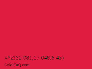 XYZ 32.081,17.048,6.45 Color is a normal red color and the nearest color is Crimson #dc143c. Hex code #e01c40 and RGB value is rgb(224,28,64). In RGB color space, this color is composed of 88% red, 11% green, 25% blue, In CMYK color space, this color is composed of 0% cyan, 88% magenta, 71% yellow , 12% black , In HSL color space, this color has a hue angle of 349° , 78% saturation and 49% lightness.