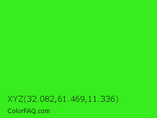 XYZ 32.082,61.469,11.336 Color is a normal green color and the nearest color is Neon Green #39ff14. Hex code #37ed1d and RGB value is rgb(55,237,29). In RGB color space, this color is composed of 22% red, 93% green, 11% blue, In CMYK color space, this color is composed of 77% cyan, 0% magenta, 88% yellow , 7% black , In HSL color space, this color has a hue angle of 113° , 85% saturation and 52% lightness.