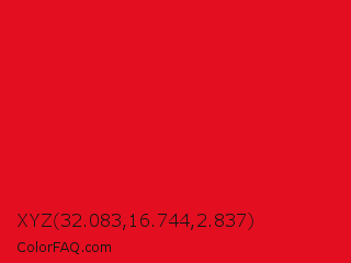 XYZ 32.083,16.744,2.837 Color is a normal red color and the nearest color is Cadmium Red #e30022. Hex code #e30e1f and RGB value is rgb(227,14,31). In RGB color space, this color is composed of 89% red, 5% green, 12% blue, In CMYK color space, this color is composed of 0% cyan, 94% magenta, 86% yellow , 11% black , In HSL color space, this color has a hue angle of 355° , 88% saturation and 47% lightness.