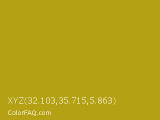 XYZ 32.103,35.715,5.863 Color is a normal yellow color and the nearest color is Sahara #b7a214. Hex code #b5a214 and RGB value is rgb(181,162,20). In RGB color space, this color is composed of 71% red, 64% green, 8% blue, In CMYK color space, this color is composed of 0% cyan, 10% magenta, 89% yellow , 29% black , In HSL color space, this color has a hue angle of 53° , 80% saturation and 39% lightness.
