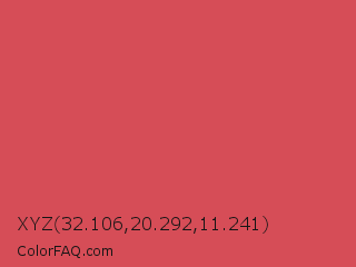 XYZ 32.106,20.292,11.241 Color is a normal red color and the nearest color is Dark Terra Cotta #cc4e5c. Hex code #d64d57 and RGB value is rgb(214,77,87). In RGB color space, this color is composed of 84% red, 30% green, 34% blue, In CMYK color space, this color is composed of 0% cyan, 64% magenta, 59% yellow , 16% black , In HSL color space, this color has a hue angle of 356° , 63% saturation and 57% lightness.