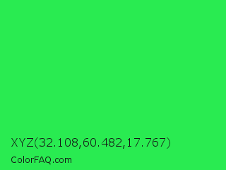 XYZ 32.108,60.482,17.767 Color is a normal green color and the nearest color is Malachite #0bda51. Hex code #29eb51 and RGB value is rgb(41,235,81). In RGB color space, this color is composed of 16% red, 92% green, 32% blue, In CMYK color space, this color is composed of 83% cyan, 0% magenta, 66% yellow , 8% black , In HSL color space, this color has a hue angle of 132° , 83% saturation and 54% lightness.