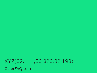 XYZ 32.111,56.826,32.198 Color is a normal green color and the nearest color is Spring Green #00ff7f. Hex code #13e387 and RGB value is rgb(19,227,135). In RGB color space, this color is composed of 7% red, 89% green, 53% blue, In CMYK color space, this color is composed of 92% cyan, 0% magenta, 41% yellow , 11% black , In HSL color space, this color has a hue angle of 153° , 85% saturation and 48% lightness.