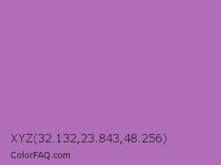 XYZ 32.132,23.843,48.256 Color is a normal magenta color and the nearest color is African Violet #b284be. Hex code #b06eb8 and RGB value is rgb(176,110,184). In RGB color space, this color is composed of 69% red, 43% green, 72% blue, In CMYK color space, this color is composed of 4% cyan, 40% magenta, 0% yellow , 28% black , In HSL color space, this color has a hue angle of 294° , 34% saturation and 58% lightness.