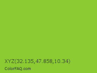 XYZ 32.135,47.858,10.34 Color is a normal green color and the nearest color is Atlantis #97cd2d. Hex code #8aca30 and RGB value is rgb(138,202,48). In RGB color space, this color is composed of 54% red, 79% green, 19% blue, In CMYK color space, this color is composed of 32% cyan, 0% magenta, 76% yellow , 21% black , In HSL color space, this color has a hue angle of 85° , 62% saturation and 49% lightness.