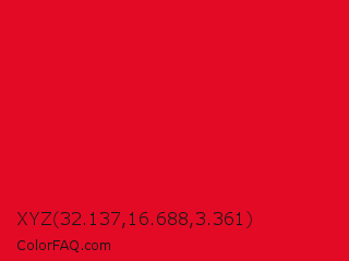 XYZ 32.137,16.688,3.361 Color is a normal red color and the nearest color is Medium Candy Apple Red #e2062c. Hex code #e30a26 and RGB value is rgb(227,10,38). In RGB color space, this color is composed of 89% red, 4% green, 15% blue, In CMYK color space, this color is composed of 0% cyan, 96% magenta, 83% yellow , 11% black , In HSL color space, this color has a hue angle of 352° , 92% saturation and 46% lightness.