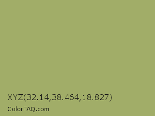 XYZ 32.14,38.464,18.827 Color is a normal yellow color and the nearest color is Green Smoke #a4af6e. Hex code #a1ad68 and RGB value is rgb(161,173,104). In RGB color space, this color is composed of 63% red, 68% green, 41% blue, In CMYK color space, this color is composed of 7% cyan, 0% magenta, 40% yellow , 32% black , In HSL color space, this color has a hue angle of 70° , 30% saturation and 54% lightness.