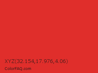 XYZ 32.154,17.976,4.06 Color is a normal red color and the nearest color is Permanent Geranium Lake #e12c2c. Hex code #e02e2b and RGB value is rgb(224,46,43). In RGB color space, this color is composed of 88% red, 18% green, 17% blue, In CMYK color space, this color is composed of 0% cyan, 79% magenta, 81% yellow , 12% black , In HSL color space, this color has a hue angle of 1° , 74% saturation and 52% lightness.