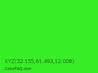 XYZ 32.155,61.493,12.008 Color is a normal green color and the nearest color is Neon Green #39ff14. Hex code #36ed26 and RGB value is rgb(54,237,38). In RGB color space, this color is composed of 21% red, 93% green, 15% blue, In CMYK color space, this color is composed of 77% cyan, 0% magenta, 84% yellow , 7% black , In HSL color space, this color has a hue angle of 115° , 85% saturation and 54% lightness.