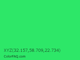 XYZ 32.157,58.709,22.734 Color is a normal green color and the nearest color is UFO Green #3cd070. Hex code #2de768 and RGB value is rgb(45,231,104). In RGB color space, this color is composed of 18% red, 91% green, 41% blue, In CMYK color space, this color is composed of 81% cyan, 0% magenta, 55% yellow , 9% black , In HSL color space, this color has a hue angle of 139° , 79% saturation and 54% lightness.