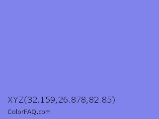 XYZ 32.159,26.878,82.85 Color is a light blue color and the nearest color is Chetwode Blue #8581d9. Hex code #8083ec and RGB value is rgb(128,131,236). In RGB color space, this color is composed of 50% red, 51% green, 93% blue, In CMYK color space, this color is composed of 46% cyan, 44% magenta, 0% yellow , 7% black , In HSL color space, this color has a hue angle of 238° , 74% saturation and 71% lightness.