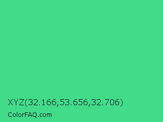 XYZ 32.166,53.656,32.706 Color is a normal green color and the nearest color is Shamrock #33cc99. Hex code #42db8a and RGB value is rgb(66,219,138). In RGB color space, this color is composed of 26% red, 86% green, 54% blue, In CMYK color space, this color is composed of 70% cyan, 0% magenta, 37% yellow , 14% black , In HSL color space, this color has a hue angle of 148° , 68% saturation and 56% lightness.