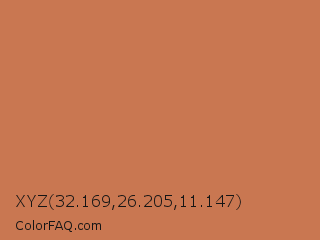 XYZ 32.169,26.205,11.147 Color is a normal orange color and the nearest color is Copper Red #cb6d51. Hex code #c97751 and RGB value is rgb(201,119,81). In RGB color space, this color is composed of 79% red, 47% green, 32% blue, In CMYK color space, this color is composed of 0% cyan, 41% magenta, 60% yellow , 21% black , In HSL color space, this color has a hue angle of 19° , 53% saturation and 55% lightness.