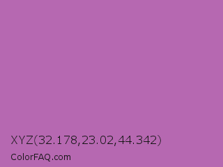 XYZ 32.178,23.02,44.342 Color is a normal magenta color and the nearest color is Pearly Purple #b768a2. Hex code #b668b1 and RGB value is rgb(182,104,177). In RGB color space, this color is composed of 71% red, 41% green, 69% blue, In CMYK color space, this color is composed of 0% cyan, 43% magenta, 3% yellow , 29% black , In HSL color space, this color has a hue angle of 304° , 35% saturation and 56% lightness.