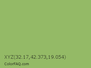 XYZ 32.17,42.373,19.054 Color is a normal green color and the nearest color is Olivine #9ab973. Hex code #94ba66 and RGB value is rgb(148,186,102). In RGB color space, this color is composed of 58% red, 73% green, 40% blue, In CMYK color space, this color is composed of 20% cyan, 0% magenta, 45% yellow , 27% black , In HSL color space, this color has a hue angle of 87° , 38% saturation and 56% lightness.