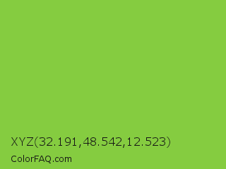XYZ 32.191,48.542,12.523 Color is a normal green color and the nearest color is Yellow Green #9acd32. Hex code #85cc40 and RGB value is rgb(133,204,64). In RGB color space, this color is composed of 52% red, 80% green, 25% blue, In CMYK color space, this color is composed of 35% cyan, 0% magenta, 69% yellow , 20% black , In HSL color space, this color has a hue angle of 90° , 58% saturation and 53% lightness.