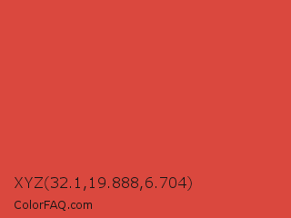 XYZ 32.1,19.888,6.704 Color is a normal red color and the nearest color is Valencia #d84437. Hex code #da483e and RGB value is rgb(218,72,62). In RGB color space, this color is composed of 85% red, 28% green, 24% blue, In CMYK color space, this color is composed of 0% cyan, 67% magenta, 72% yellow , 15% black , In HSL color space, this color has a hue angle of 4° , 68% saturation and 55% lightness.