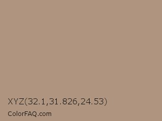 XYZ 32.1,31.826,24.53 Color is a normal orange color and the nearest color is Sandrift #ab917a. Hex code #af947f and RGB value is rgb(175,148,127). In RGB color space, this color is composed of 69% red, 58% green, 50% blue, In CMYK color space, this color is composed of 0% cyan, 15% magenta, 27% yellow , 31% black , In HSL color space, this color has a hue angle of 26° , 23% saturation and 59% lightness.