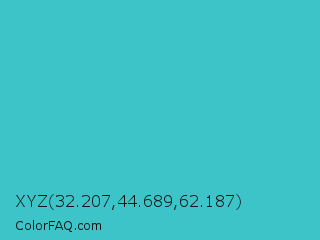 XYZ 32.207,44.689,62.187 Color is a normal cyan color and the nearest color is Sea Serpent #4bc7cf. Hex code #3dc4c9 and RGB value is rgb(61,196,201). In RGB color space, this color is composed of 24% red, 77% green, 79% blue, In CMYK color space, this color is composed of 70% cyan, 2% magenta, 0% yellow , 21% black , In HSL color space, this color has a hue angle of 182° , 56% saturation and 51% lightness.