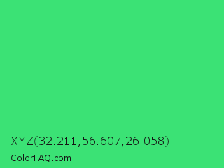 XYZ 32.211,56.607,26.058 Color is a normal green color and the nearest color is UFO Green #3cd070. Hex code #3be275 and RGB value is rgb(59,226,117). In RGB color space, this color is composed of 23% red, 89% green, 46% blue, In CMYK color space, this color is composed of 74% cyan, 0% magenta, 48% yellow , 11% black , In HSL color space, this color has a hue angle of 141° , 74% saturation and 56% lightness.