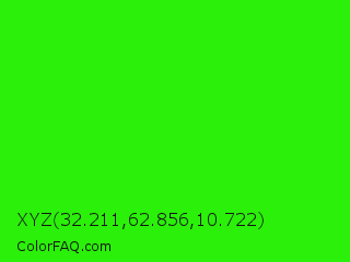 XYZ 32.211,62.856,10.722 Color is a normal green color and the nearest color is Neon Green #39ff14. Hex code #2bf00a and RGB value is rgb(43,240,10). In RGB color space, this color is composed of 17% red, 94% green, 4% blue, In CMYK color space, this color is composed of 82% cyan, 0% magenta, 96% yellow , 6% black , In HSL color space, this color has a hue angle of 111° , 92% saturation and 49% lightness.