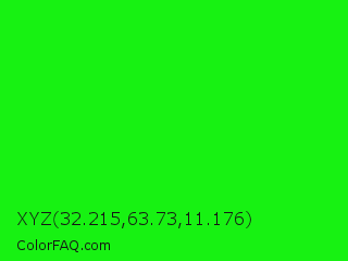 XYZ 32.215,63.73,11.176 Color is a normal green color and the nearest color is Green #00ff00. Hex code #17f212 and RGB value is rgb(23,242,18). In RGB color space, this color is composed of 9% red, 95% green, 7% blue, In CMYK color space, this color is composed of 90% cyan, 0% magenta, 93% yellow , 5% black , In HSL color space, this color has a hue angle of 119° , 90% saturation and 51% lightness.