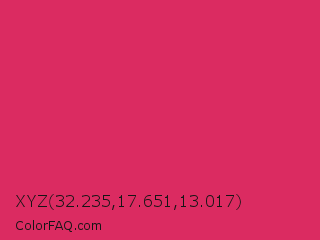 XYZ 32.235,17.651,13.017 Color is a normal rose color and the nearest color is Cerise Red #de3163. Hex code #db2b61 and RGB value is rgb(219,43,97). In RGB color space, this color is composed of 86% red, 17% green, 38% blue, In CMYK color space, this color is composed of 0% cyan, 80% magenta, 56% yellow , 14% black , In HSL color space, this color has a hue angle of 342° , 71% saturation and 51% lightness.