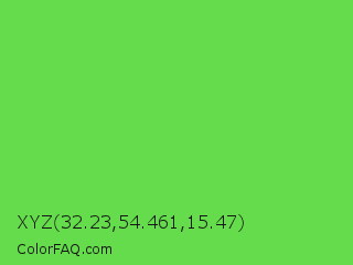 XYZ 32.23,54.461,15.47 Color is a normal green color and the nearest color is Mantis #74c365. Hex code #65dc4b and RGB value is rgb(101,220,75). In RGB color space, this color is composed of 40% red, 86% green, 29% blue, In CMYK color space, this color is composed of 54% cyan, 0% magenta, 66% yellow , 14% black , In HSL color space, this color has a hue angle of 109° , 67% saturation and 58% lightness.