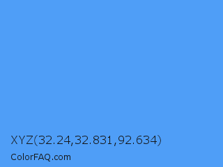 XYZ 32.24,32.831,92.634 Color is a light blue color and the nearest color is Blue Jeans #5dadec. Hex code #4f9ef7 and RGB value is rgb(79,158,247). In RGB color space, this color is composed of 31% red, 62% green, 97% blue, In CMYK color space, this color is composed of 68% cyan, 36% magenta, 0% yellow , 3% black , In HSL color space, this color has a hue angle of 212° , 91% saturation and 64% lightness.
