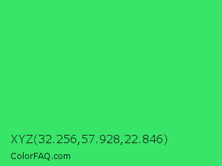 XYZ 32.256,57.928,22.846 Color is a normal green color and the nearest color is UFO Green #3cd070. Hex code #39e569 and RGB value is rgb(57,229,105). In RGB color space, this color is composed of 22% red, 90% green, 41% blue, In CMYK color space, this color is composed of 75% cyan, 0% magenta, 54% yellow , 10% black , In HSL color space, this color has a hue angle of 137° , 77% saturation and 56% lightness.