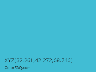 XYZ 32.261,42.272,68.746 Color is a normal cyan color and the nearest color is Sea Serpent #4bc7cf. Hex code #41bdd4 and RGB value is rgb(65,189,212). In RGB color space, this color is composed of 25% red, 74% green, 83% blue, In CMYK color space, this color is composed of 69% cyan, 11% magenta, 0% yellow , 17% black , In HSL color space, this color has a hue angle of 189° , 63% saturation and 54% lightness.