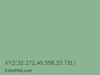 XYZ 32.272,40.558,33.731 Color is a light green color and the nearest color is Dark Sea Green #8fbc8f. Hex code #8ab593 and RGB value is rgb(138,181,147). In RGB color space, this color is composed of 54% red, 71% green, 58% blue, In CMYK color space, this color is composed of 24% cyan, 0% magenta, 19% yellow , 29% black , In HSL color space, this color has a hue angle of 133° , 23% saturation and 63% lightness.