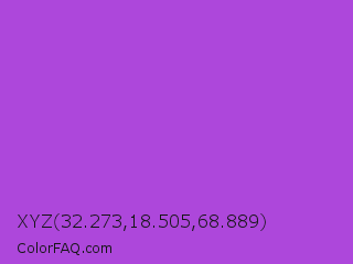 XYZ 32.273,18.505,68.889 Color is a normal purple color and the nearest color is Medium Orchid #ba55d3. Hex code #ad47db and RGB value is rgb(173,71,219). In RGB color space, this color is composed of 68% red, 28% green, 86% blue, In CMYK color space, this color is composed of 21% cyan, 68% magenta, 0% yellow , 14% black , In HSL color space, this color has a hue angle of 281° , 67% saturation and 57% lightness.