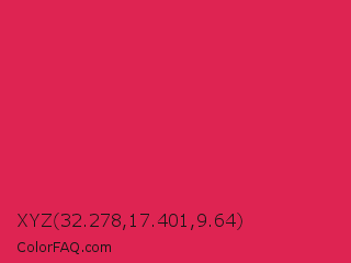 XYZ 32.278,17.401,9.64 Color is a normal red color and the nearest color is Amaranth #e52b50. Hex code #de2452 and RGB value is rgb(222,36,82). In RGB color space, this color is composed of 87% red, 14% green, 32% blue, In CMYK color space, this color is composed of 0% cyan, 84% magenta, 63% yellow , 13% black , In HSL color space, this color has a hue angle of 345° , 74% saturation and 51% lightness.