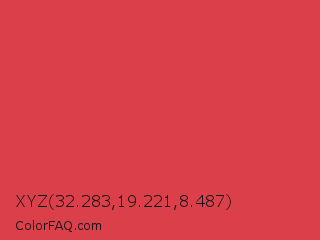 XYZ 32.283,19.221,8.487 Color is a normal red color and the nearest color is Jasper #d73b3e. Hex code #db404a and RGB value is rgb(219,64,74). In RGB color space, this color is composed of 86% red, 25% green, 29% blue, In CMYK color space, this color is composed of 0% cyan, 71% magenta, 66% yellow , 14% black , In HSL color space, this color has a hue angle of 356° , 68% saturation and 55% lightness.