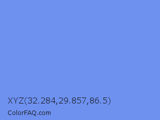 XYZ 32.284,29.857,86.5 Color is a light blue color and the nearest color is Cornflower Blue #6495ed. Hex code #6e91f0 and RGB value is rgb(110,145,240). In RGB color space, this color is composed of 43% red, 57% green, 94% blue, In CMYK color space, this color is composed of 54% cyan, 40% magenta, 0% yellow , 6% black , In HSL color space, this color has a hue angle of 224° , 81% saturation and 69% lightness.