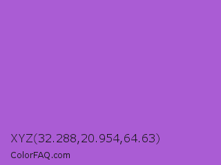 XYZ 32.288,20.954,64.63 Color is a normal purple color and the nearest color is Rich Lilac #b666d2. Hex code #aa5cd4 and RGB value is rgb(170,92,212). In RGB color space, this color is composed of 67% red, 36% green, 83% blue, In CMYK color space, this color is composed of 20% cyan, 57% magenta, 0% yellow , 17% black , In HSL color space, this color has a hue angle of 279° , 58% saturation and 60% lightness.