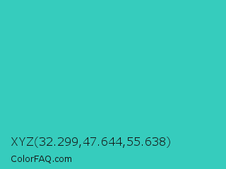 XYZ 32.299,47.644,55.638 Color is a normal cyan color and the nearest color is Maximum Blue Green #30bfbf. Hex code #36ccbd and RGB value is rgb(54,204,189). In RGB color space, this color is composed of 21% red, 80% green, 74% blue, In CMYK color space, this color is composed of 74% cyan, 0% magenta, 7% yellow , 20% black , In HSL color space, this color has a hue angle of 174° , 60% saturation and 51% lightness.